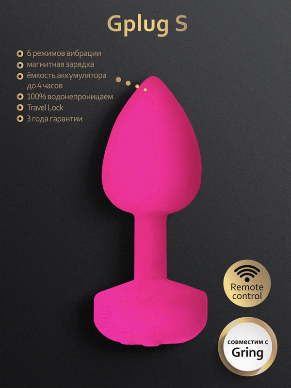 Важно! Если исполь­зо­вать про­бку "G-​Plug S" совместно с кольцом "G-​Ring", кольцо в этом случае будет выполнять роль дистанционного пульта управления. Синхронизировать кольцо с пробкой очень просто, следует одновременно нажать на кнопку включения пробки и кнопку "+" на кольце. Световой индикатор должен загореться на обоих девайсах. Далее, при помощи кнопки "вибрация" на кольце переключайте режимы, а при помощи кнопок "+" и "-" на кольце меняйте скорости! Для отключения синхронизации нажмите кнопку "-" на кольце!